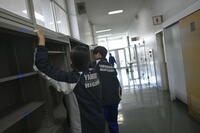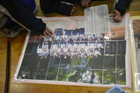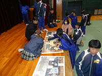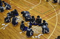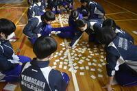 学校中に隠された3年生の写真のピースを全校生徒が協力して探しました。